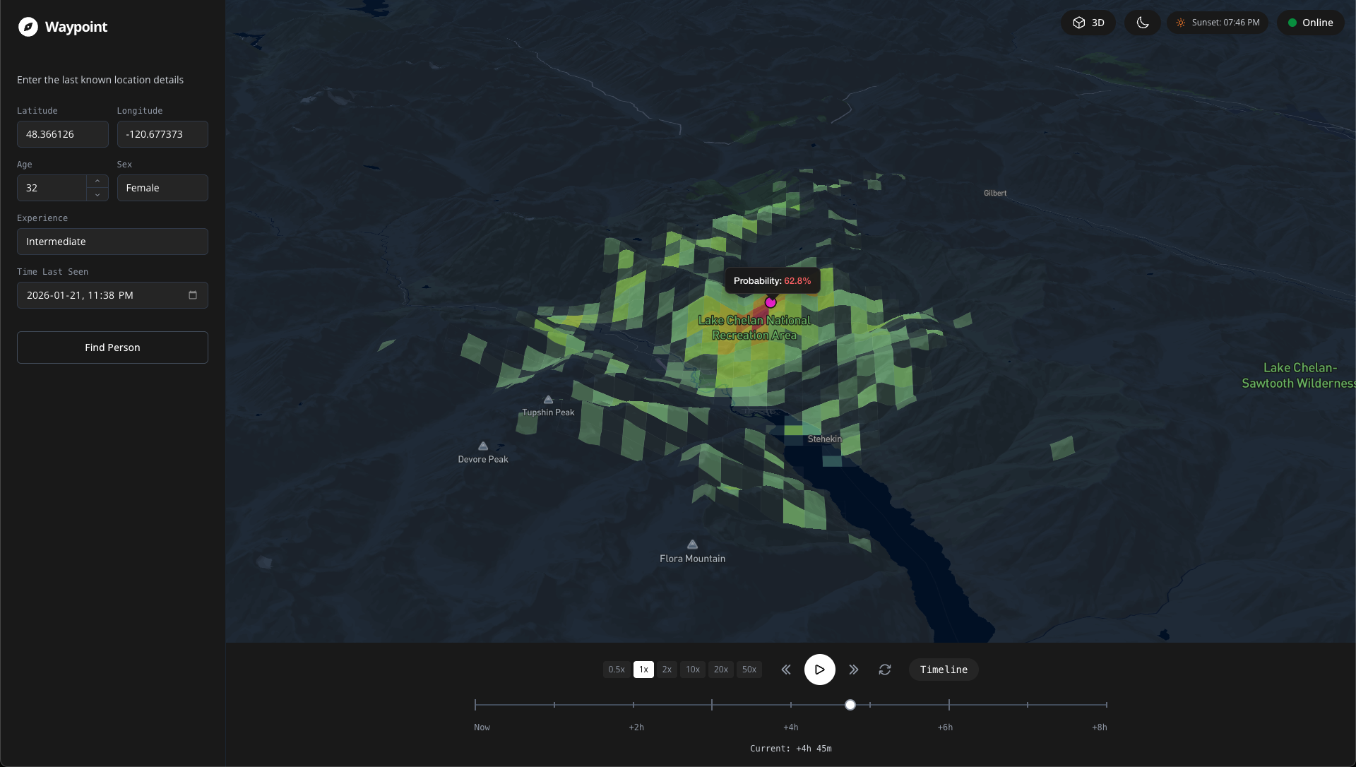 Interactive search and rescue predictive visualization platform. Runs Monte Carlo simulations to predict the probable location of missing persons based on behavioral psychology, terrain analysis, and environmental factors.